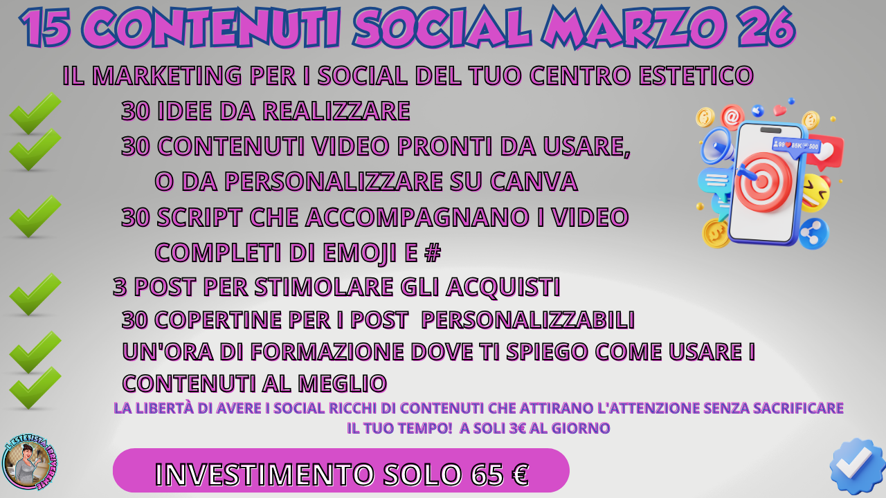 💎 Tutto questo a un prezzo incredibilmente conveniente, poco più di un caffè al giorno. Con soli 65€, hai accesso a 15 video di alta qualità dedicati ai trattamenti corpo per i tuoi social media.