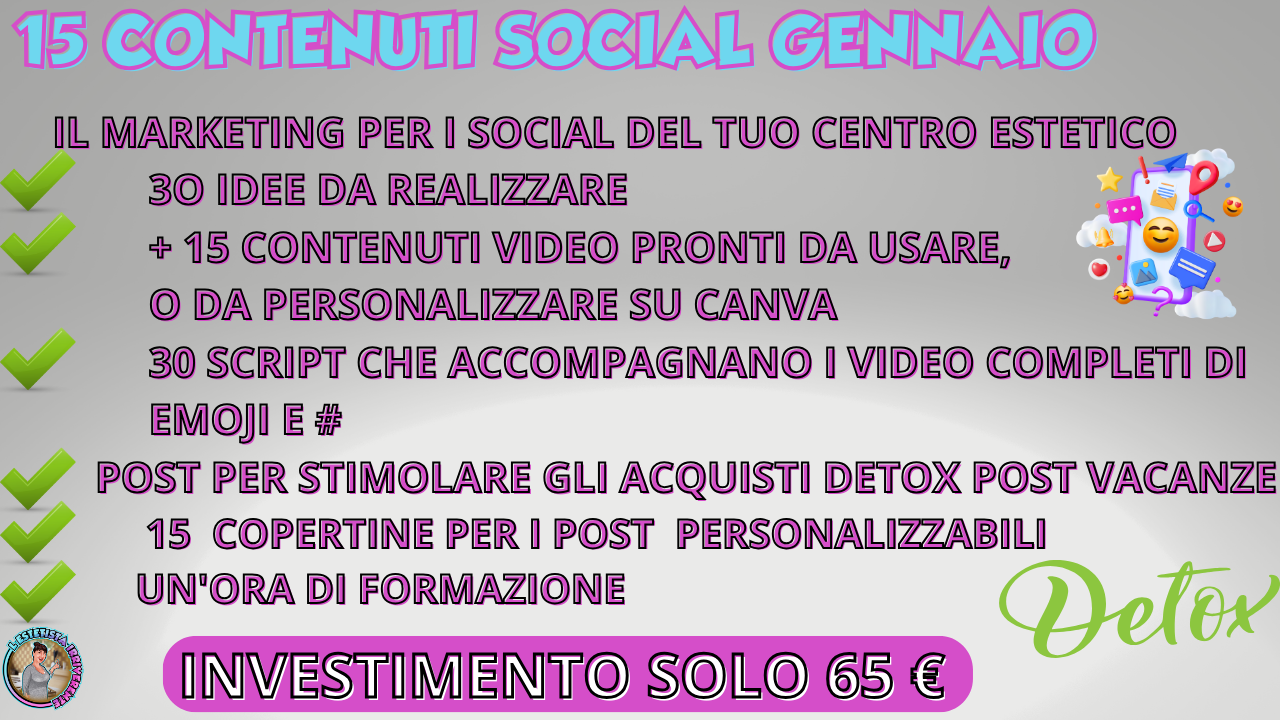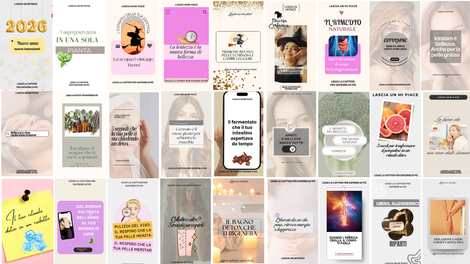 📈 Con questa strategia, il tuo centro estetico rimane sempre al centro della conversazione. I contenuti che ricevi non sono generici: sono studiati per informare, incuriosire e persuadere le clienti a prenotare subito. A gennaio il tema è Detox, perfetto per intercettare il bisogno di leggerezza e rigenerazione dopo gli stravizi delle feste.