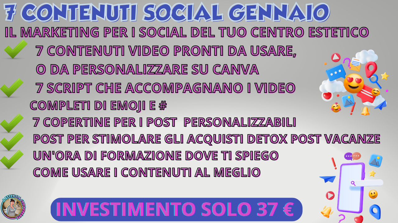 QUI PUOI VEDERE I 7 CONTENUTI VIDEO PER I SOCIAL DEL TUO CENTRO ESTETICO A GENNAIO